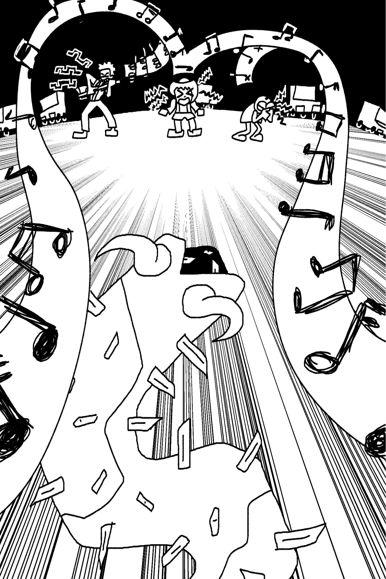 “Keep going,” Mitica shouted! They summoned [LOCKE BACK], flipped it over and started strumming it, making ‘neu neu neu neu’ air guitar sounds to back me up. A kid from the customer crowd ran up too, some foul-smelling geek tweenager with swirly glasses and a graphic t-shirt, and started ooh-aahing me a bassline.